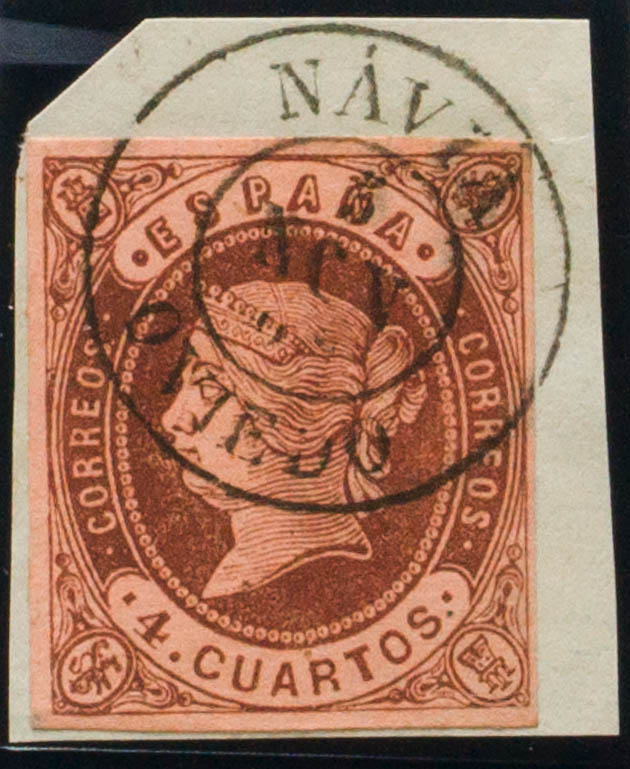 △ 58. 1862. 4 cuartos castaño, sobre fragmento. Matasello NAVIA / OVIEDO. MAGNIFICO.