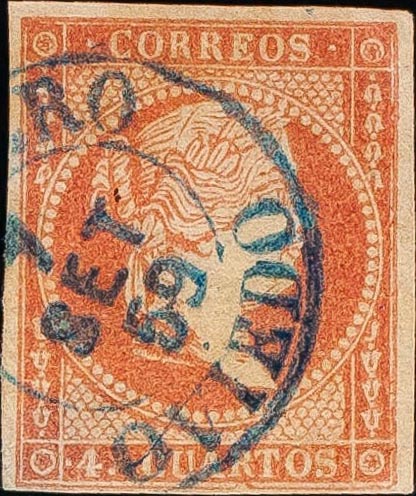 48. 1855. 4 cuartos rojo. Matasello CUDILLERO / OVIEDO (Tipo I), en azul. BONITO Y RARO.
