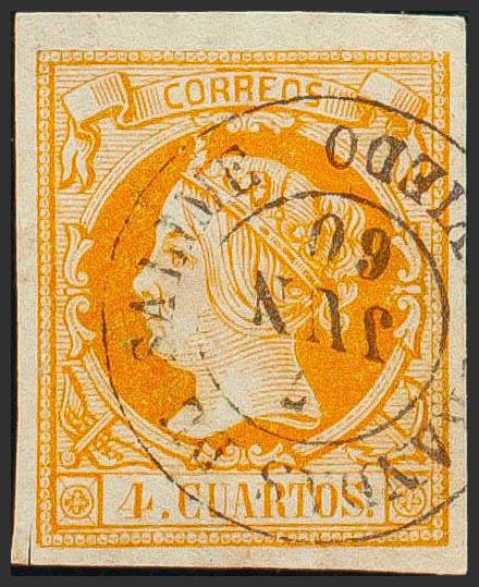 52. 1860. 4 cuartos amarillo. Matasello GRANDAS DE SALIME / OVIEDO. MAGNIFICO.