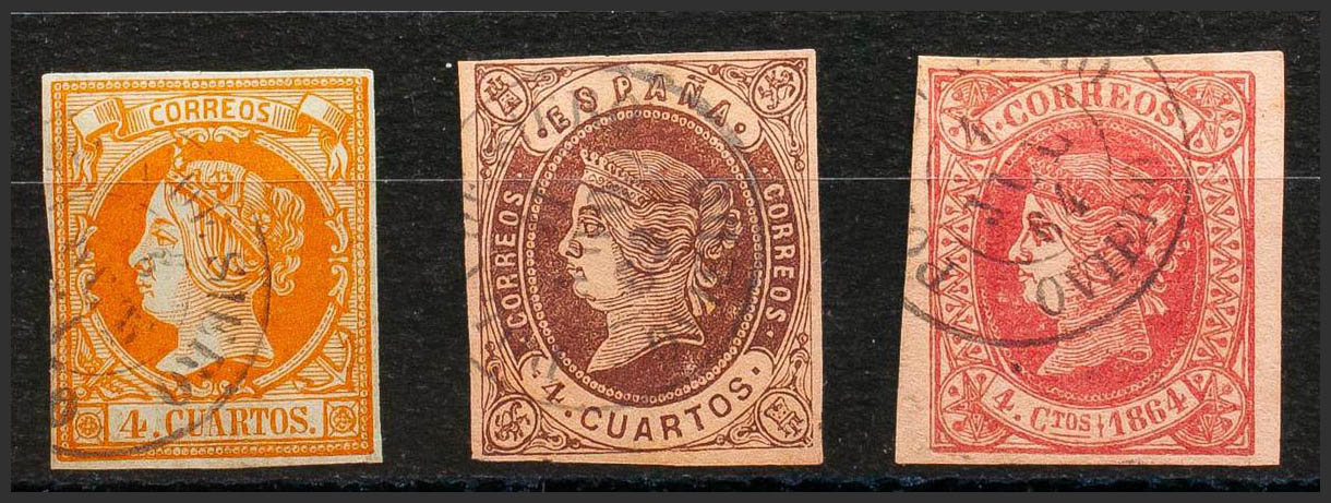 52, 58, 64. (1860ca). Conjunto de tres sellos del 4 cuartos amarillo, castaño y rosa, inutilizados con el matasello POLA DE SIERO / OVIEDO. MAGNIFICO.