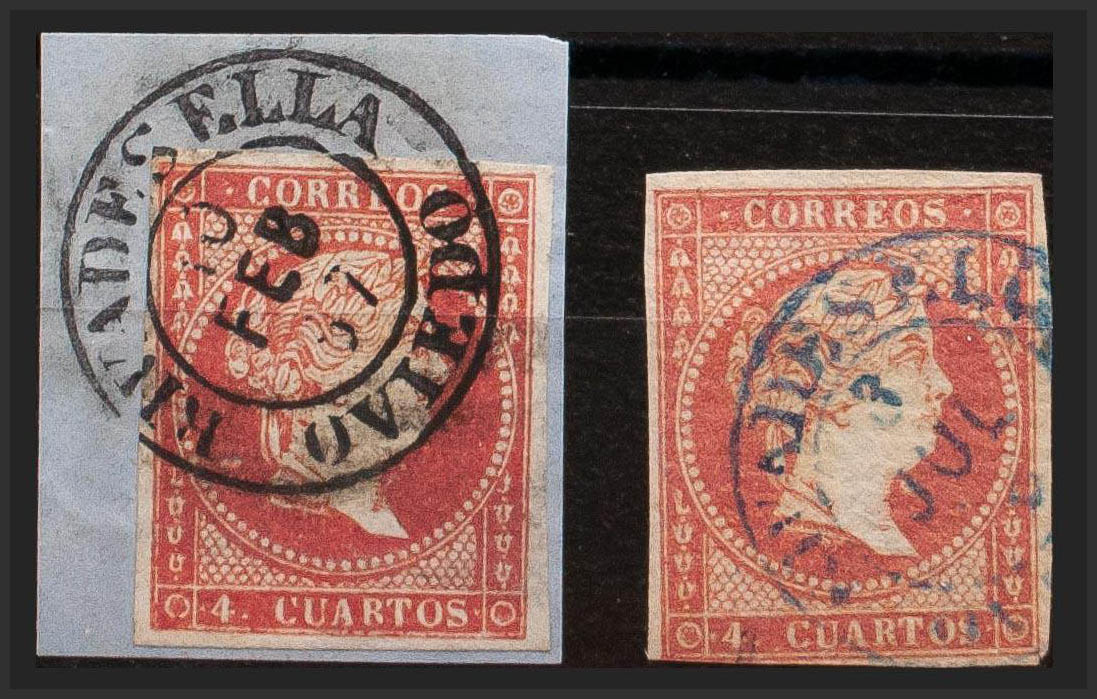 48(2). (1855ca). 4 cuartos rojo, dos sellos. Matasello RIVADESELLA / OVIEDO (Tipo I), en negro y azul. MAGNIFICO.