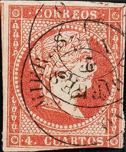 48. 1855. 4 cuartos rojo. Matasello MIERES / OVIEDO. MAGNIFICO Y RARO.