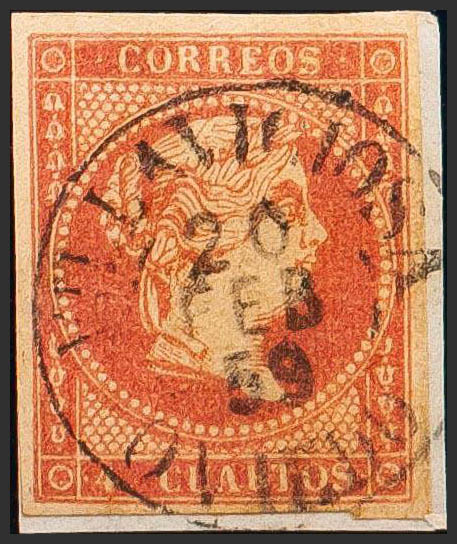 48. 1855. 4 cuartos rojo. Matasello VILLAVICIOSA / ASTURIAS (Tipo I). MAGNIFICO.