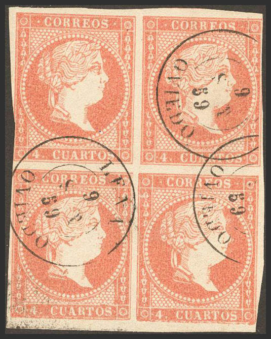 48(4). 1856. 4 cuartos rojo, bloque de cuatro. Matasello LENA / OVIEDO. MAGNIFICO Y RARO.