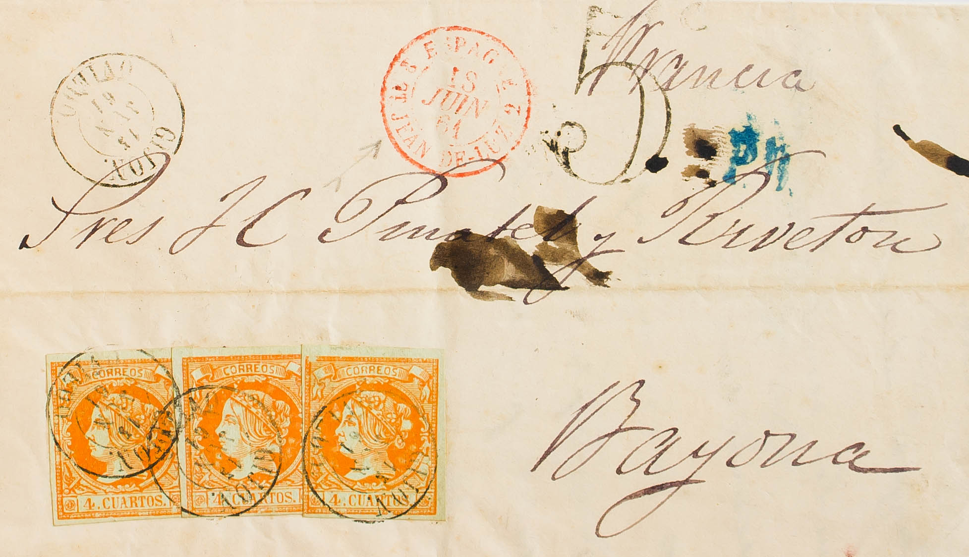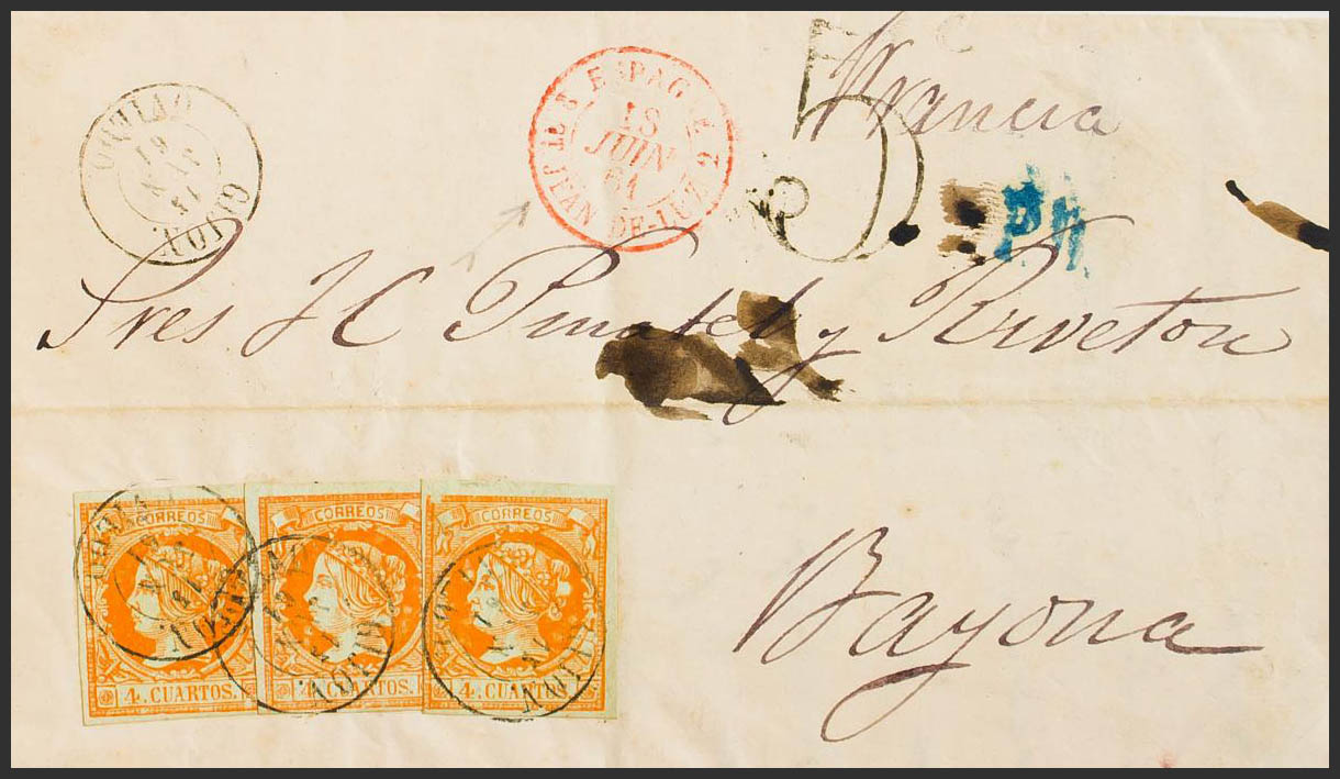 52(3). 1861. 4 cuartos amarillo, tres sellos. GIJON a BAYONA (FRANCIA). MAGNIFICA E INUSUAL COMBINACION PARA COMPONER LA TARIFA DE 12 CUARTOS A FRANCIA.