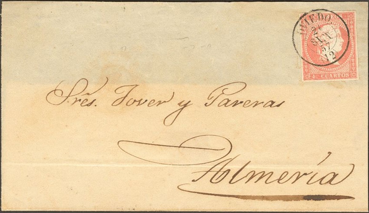 52. 1857. 4 cuartos rojo. Frontal de OVIEDO a ALMERIA. Matasello OVIEDO / (12). LUJO.