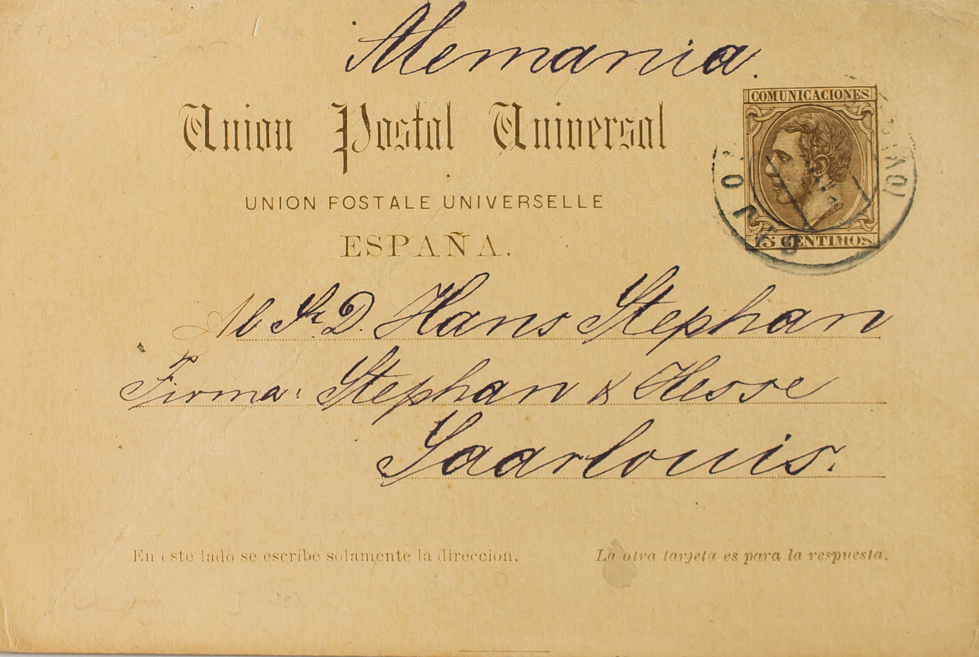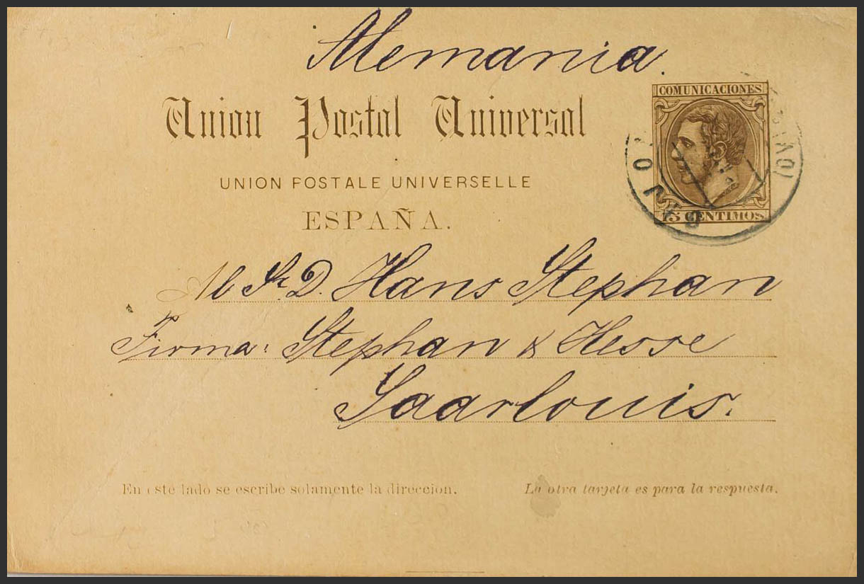 EP18i. 1892. 15 cts castaño sobre Tarjeta Entero Postal de ida de GIJON a SAARLOUIS (ALEMANIA). BONITA Y RARA. Edifil 2016: 153 Euros