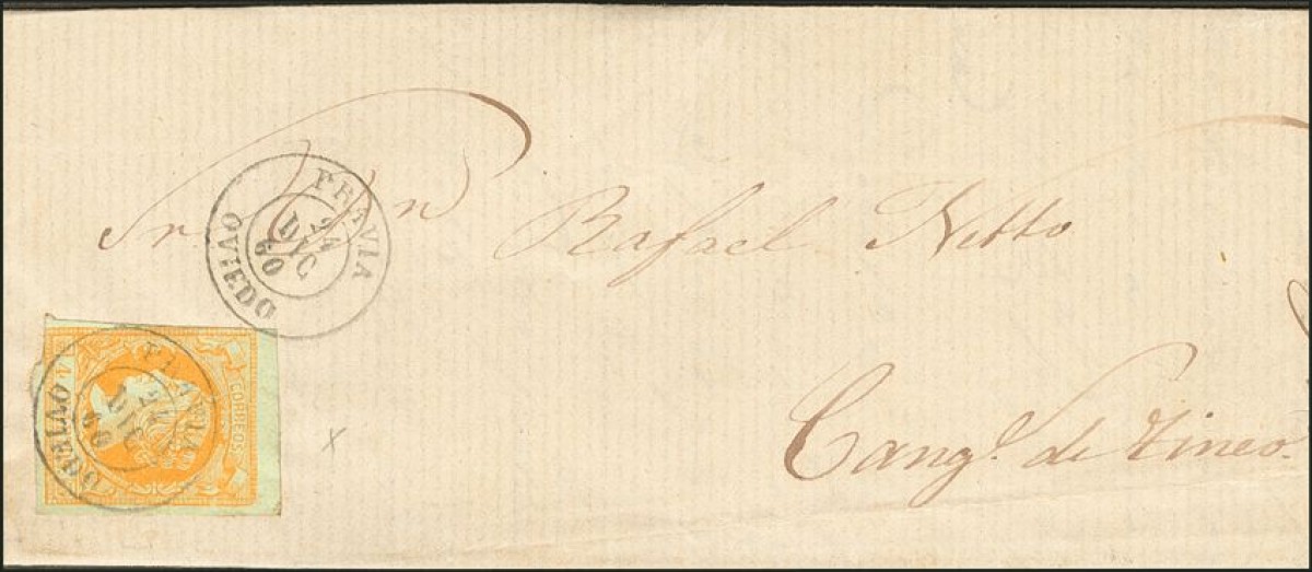 52. 1860. 4 cuartos amarillo. PRAVIA a CANGAS DE TINEO. Matasello PRAVIA / OVIEDO. MAGNIFICA.
