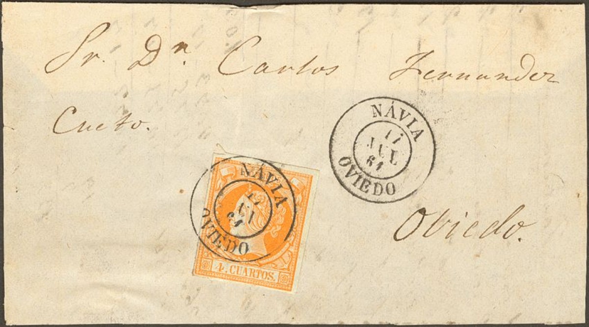 52. 1860. 4 cuartos amarillo. Frontal de NAVIA a OVIEDO. Matasello NAVIA / OVIEDO. MAGNIFICA.