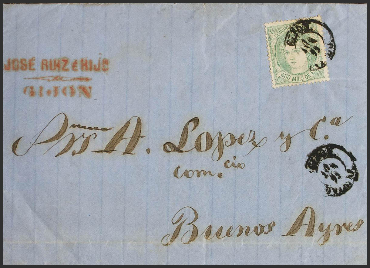 110. 1870. 400 mils verde. GIJON a BUENOS AIRES (ARGENTINA). Matasello GIJON / OVIEDO. MAGNIFICA Y MUY RARO USO DE LA TARIFA DE OCTUBRE DE 1858 DE 4 REALES CORRESPONDIENTES A 400 MILS, POR LA VIA INGLESA.