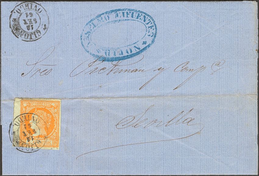 52. 1860. 4 cuartos amarillo. GIJON a SEVILLA. Matasello GIJON / OVIEDO. BONITA.