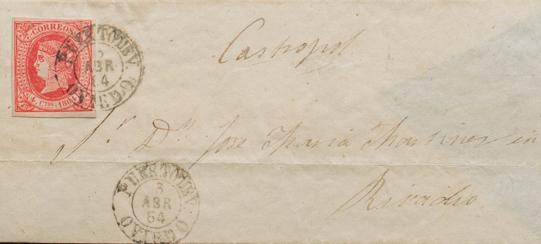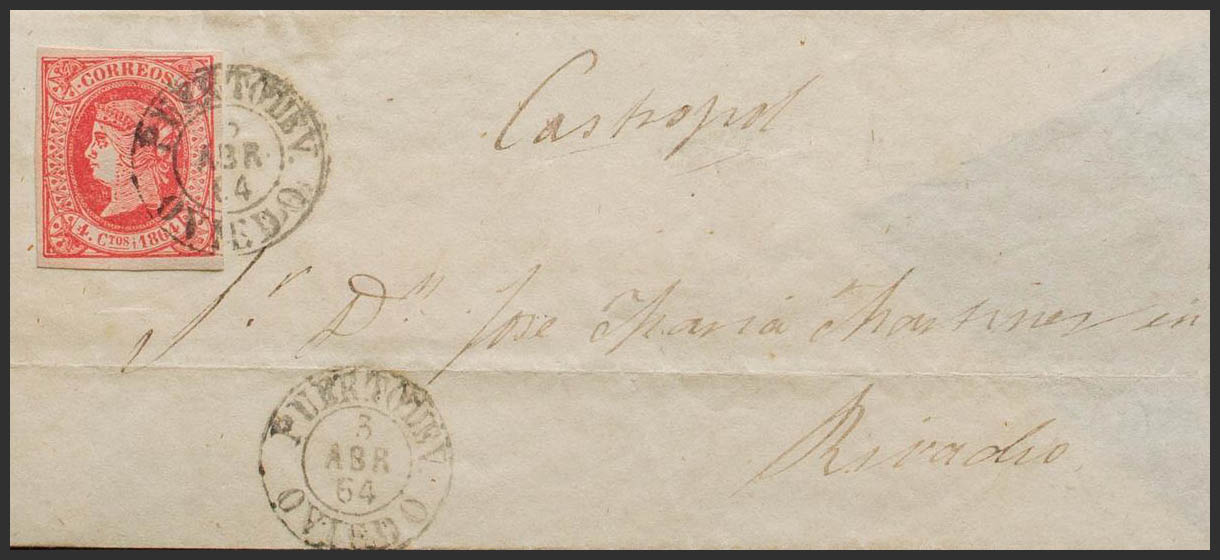 64. 1864. 4 cuartos rojo. PUERTO DE VEGA a RIVADEO. Matasello PUERTO DE V. / OVIEDO (Tipo I). MAGNIFICA Y EXTRAORDINARIAMENTE RARA.