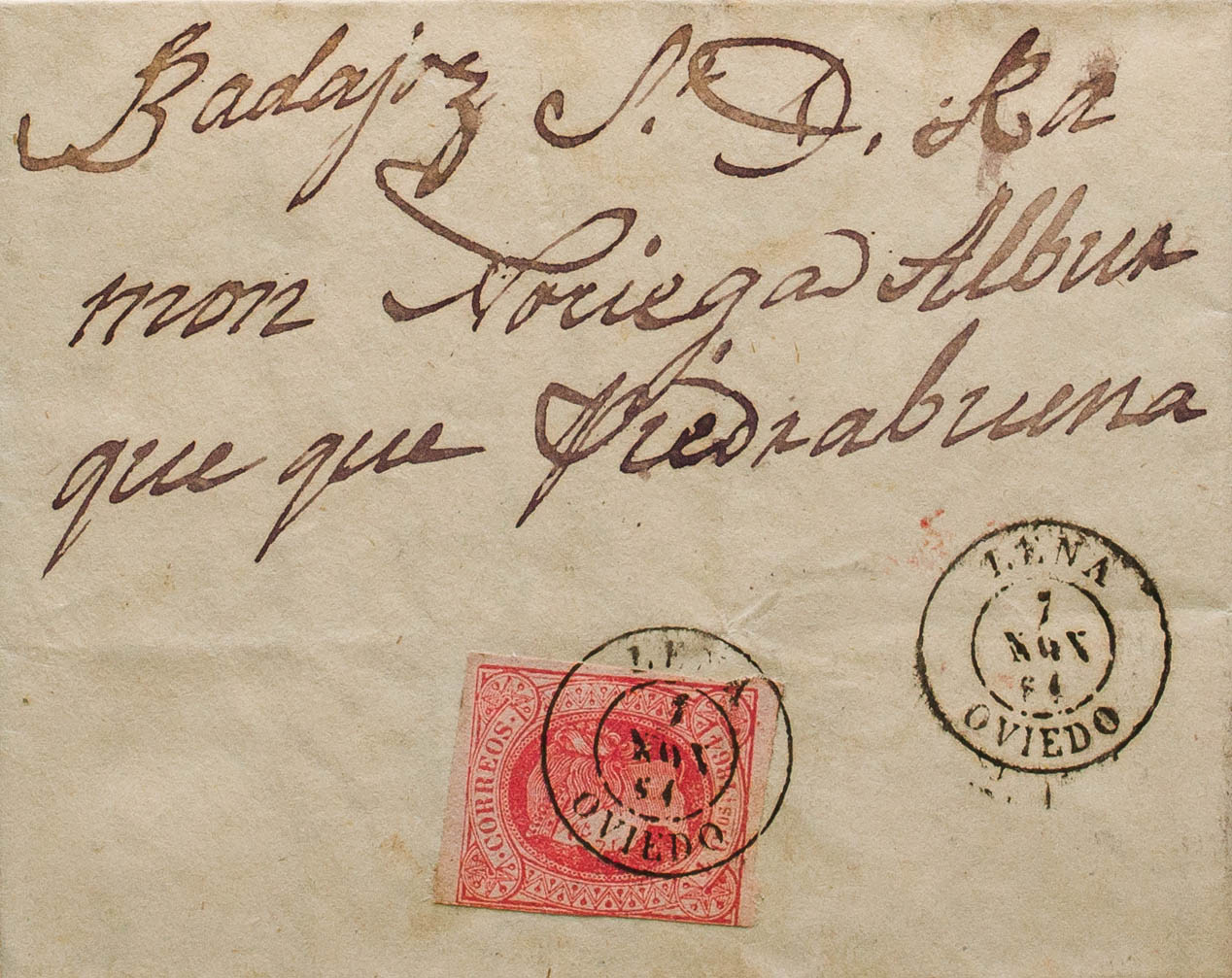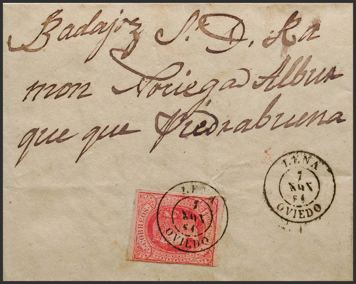 64. 1864. 4 cuartos rojo. CAMPOMANES a ALBURQUERQUE. Matasello LENA / OVIEDO. MAGNIFICA Y EXTRAORDINARIAMENTE RARA.