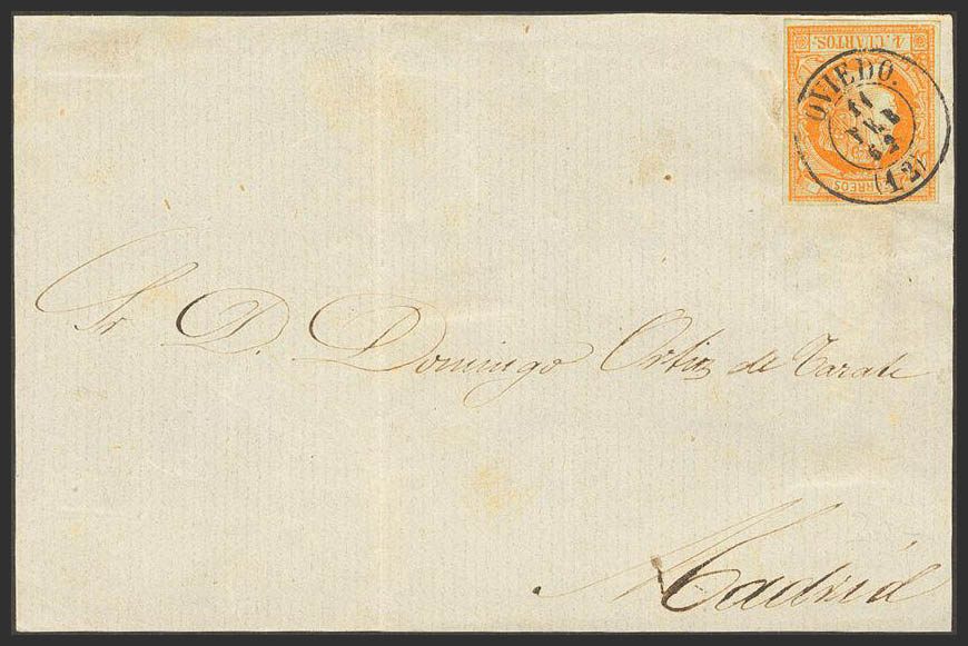52. 1862. 4 cuartos amarillo. Frontal de OVIEDO a MADRID. Matasello OVIEDO / (12). MAGNIFICA.