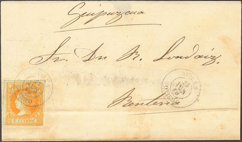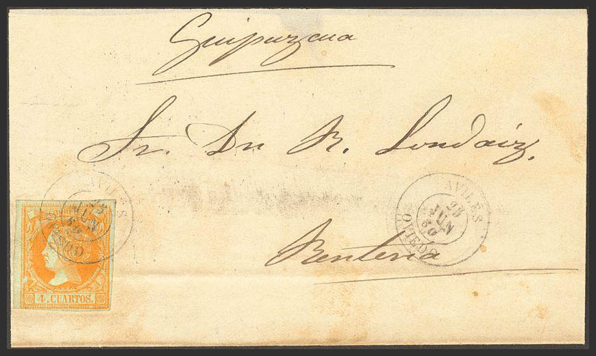 52. 1860. 4 cuartos amarillo. AVILES a RENTERIA. Matasello AVILES / OVIEDO.