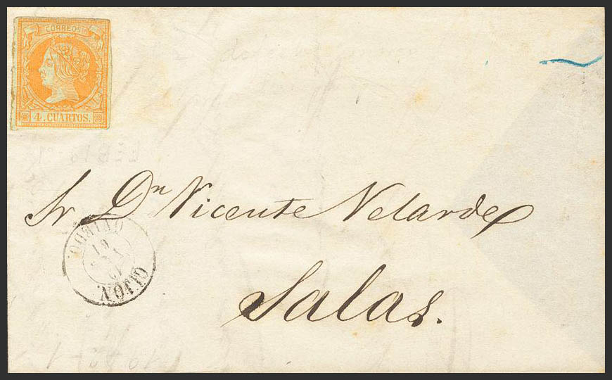 52. 1861. 4 cuartos amarillo. GIJON a SALAS. Sin utilizar. RARA.