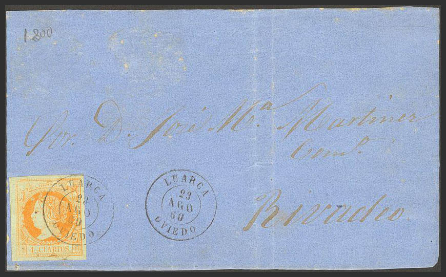 52. 1860. 4 cuartos amarillo. Frontal de LUARCA a RIVADEO. Matasello LUARCA / OVIEDO. MAGNIFICA.