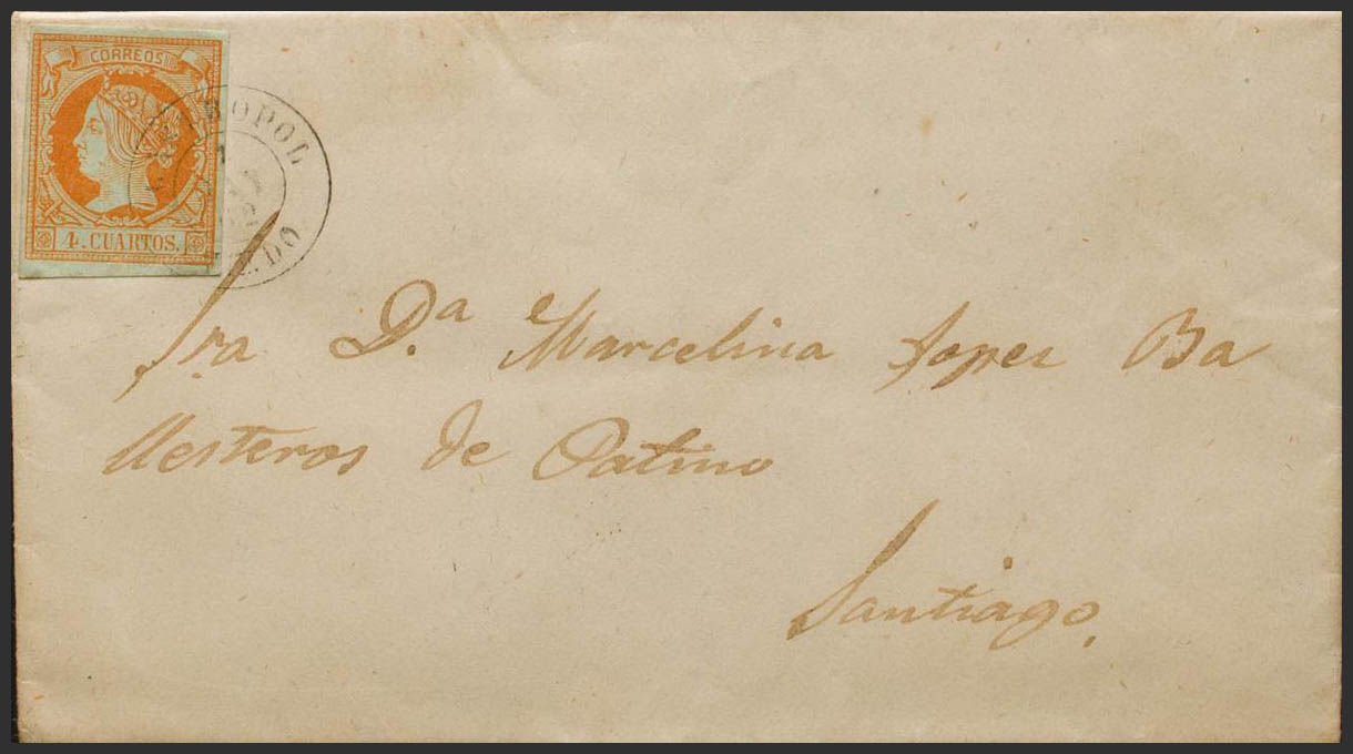 52. 1862. 4 cuartos naranja. VEGADEO a SANTIAGO. Matasello CASTROPOL / SANTIAGO. MAGNIFICA.