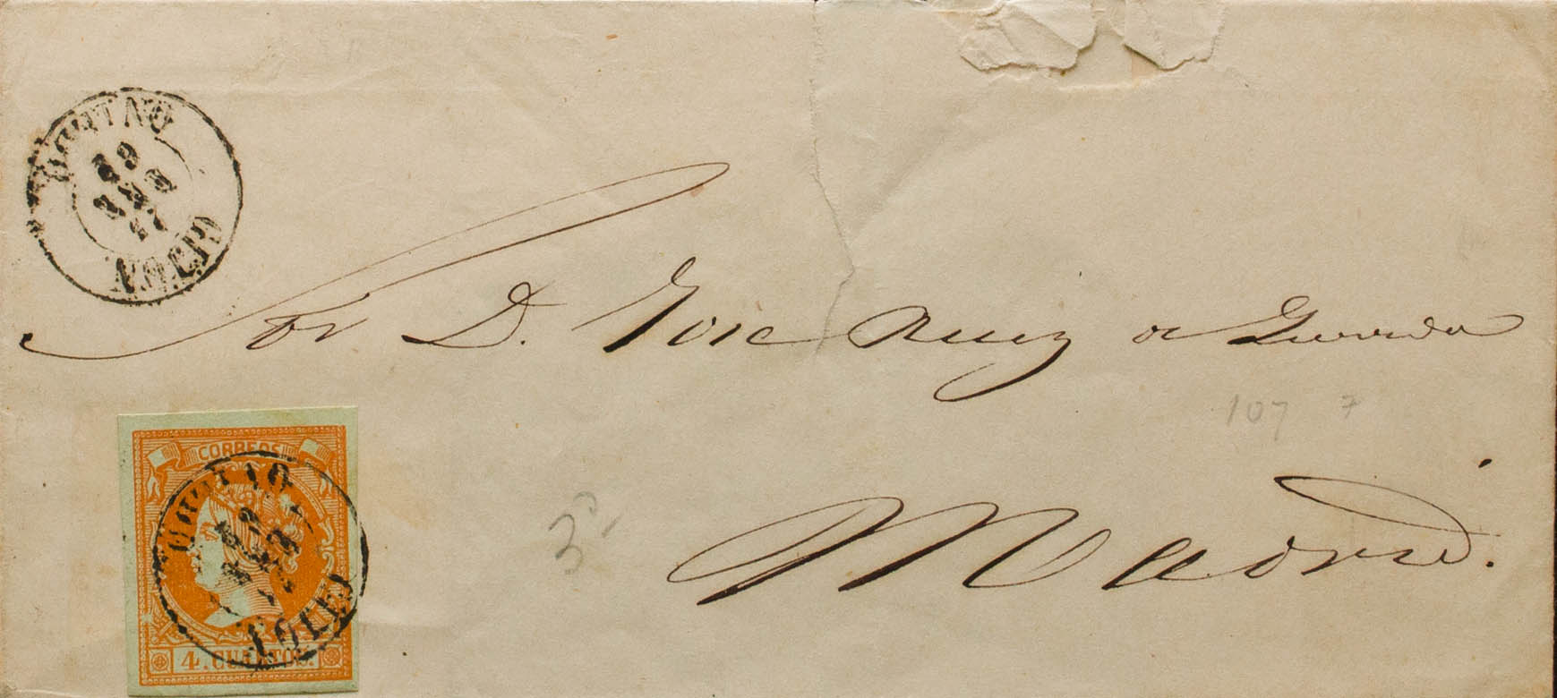 52. 1862. 4 cuartos naranja. GIJON a MADRID (corte de apertura en el frente). Matasello GIJON / OVIEDO. BONITA.