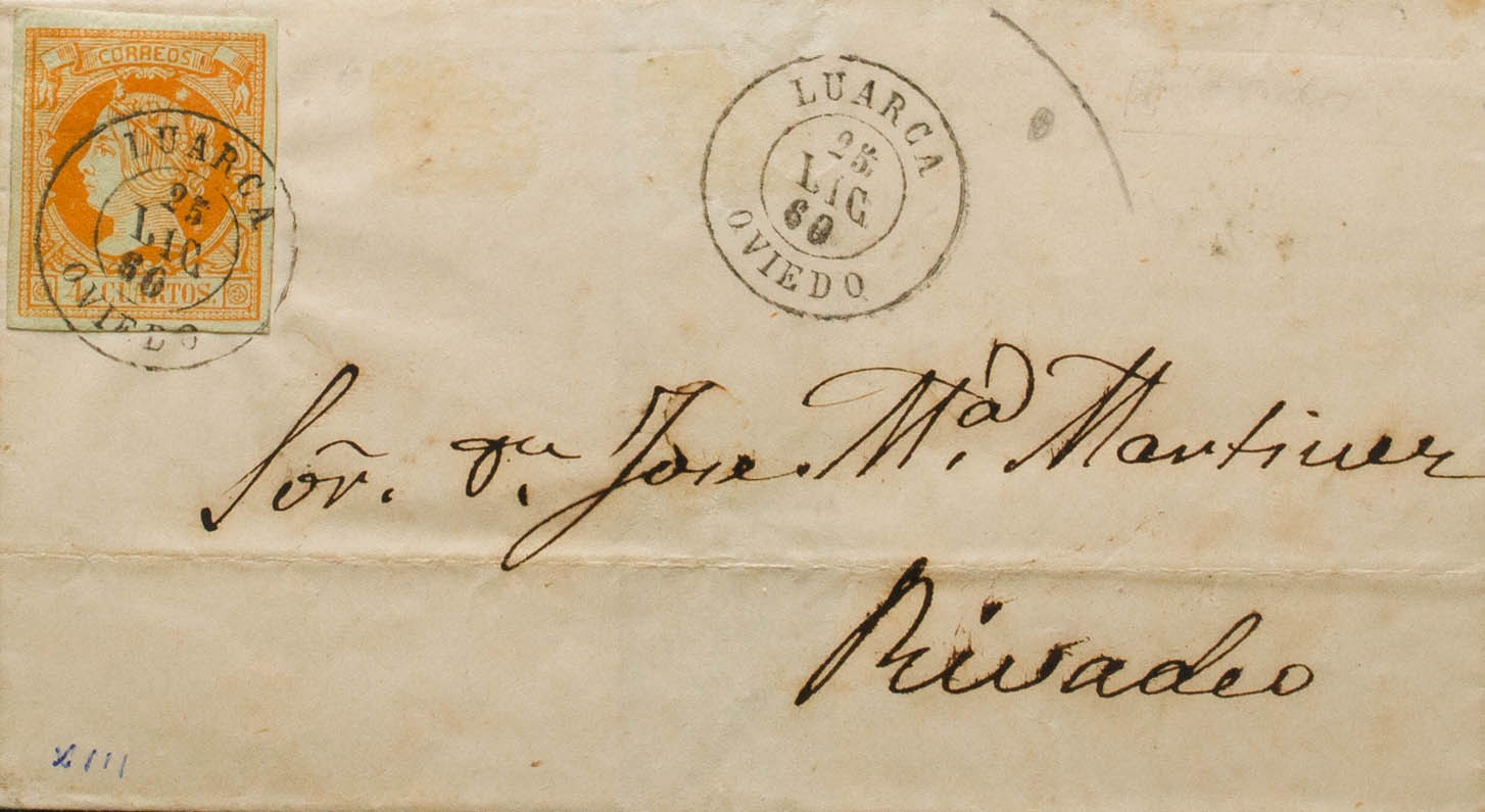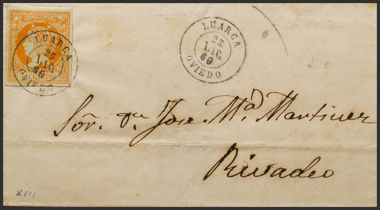 52. 1860. 4 cuartos naranja. LUARCA a RIBADEO. Matasello LUARCA / OVIEDO. MAGNIFICA.