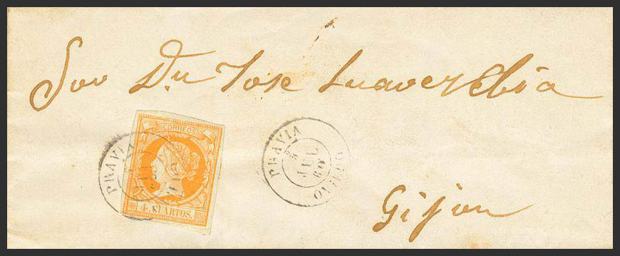 52. 1860. 4 cuartos amarillo. PRAVIA a GIJON. Matasello PRAVIA / OVIEDO. BONITA.