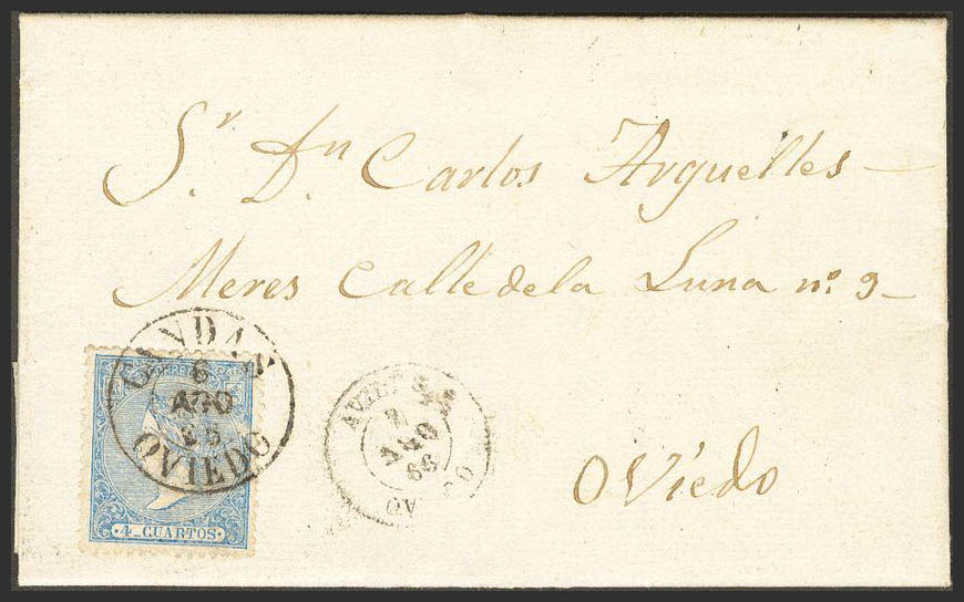 81. 1866. 4 cuartos azul. CANDAS a OVIEDO. Matasello CANDAS / OVIEDO (Tipo I). MAGNIFICA Y RARISIMA.