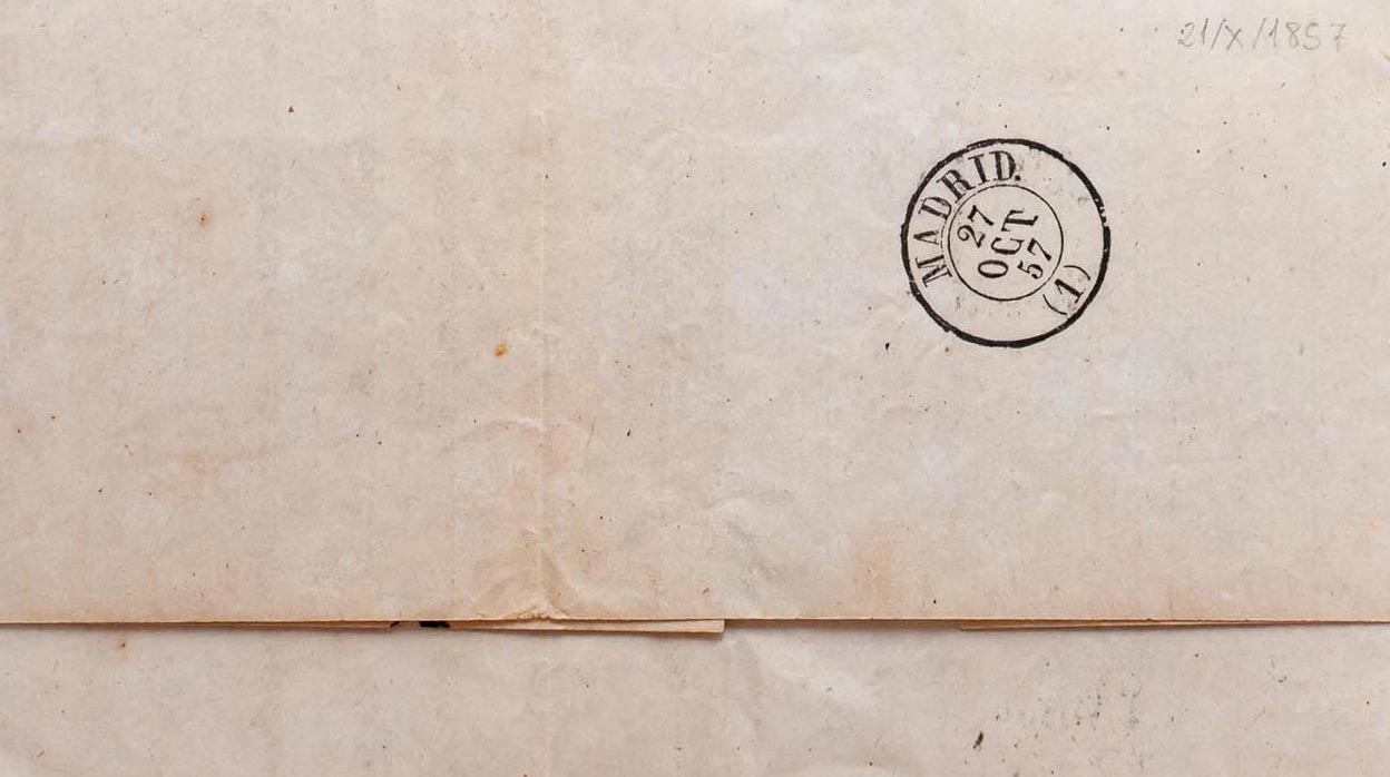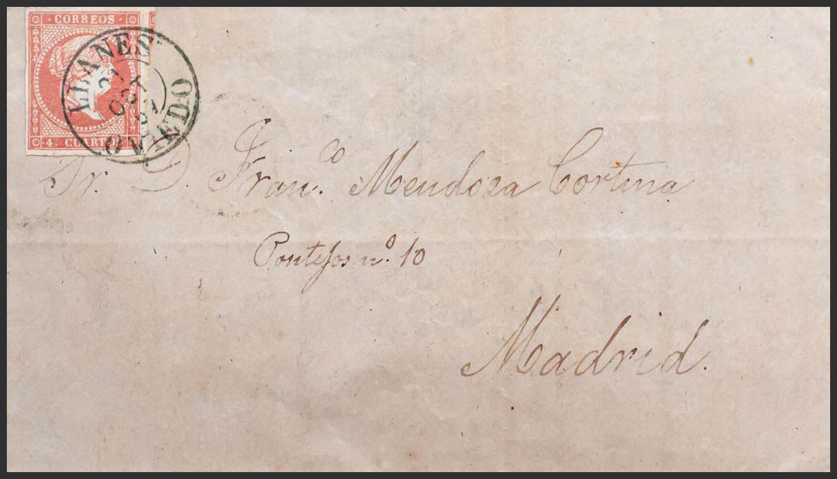 48. 1857. 4 cuartos rojo. LLANES a MADRID. Matasello LLANES / OVIEDO, en azul-negro (Tipo I). MAGNIFICA Y RARA.