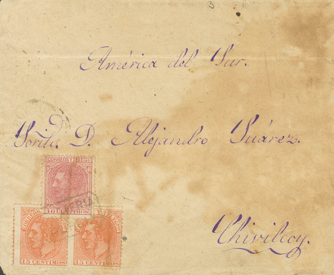 210(2), 202. 1888. 15 cts naranja, dos sellos y 10 cts carmín. PORCIA (ASTURIAS) a CHIVILCOY (ARGENTINA). Matasello CARTERIA / PORCIA, al dorso tránsito por Castropol y llegada. BONITA Y RARISIMA.
