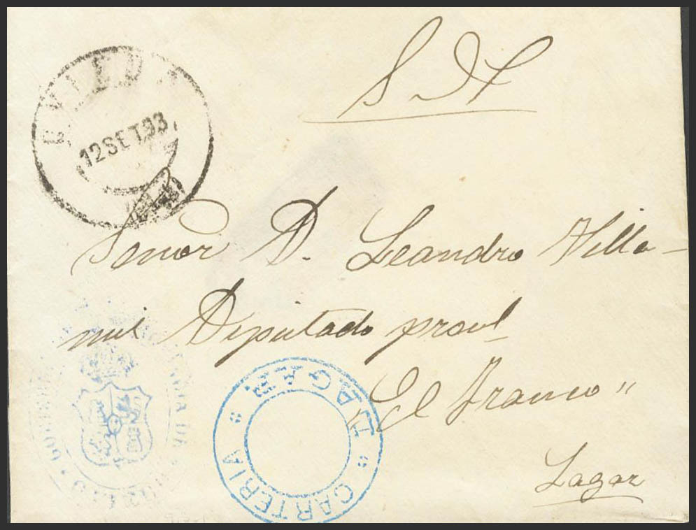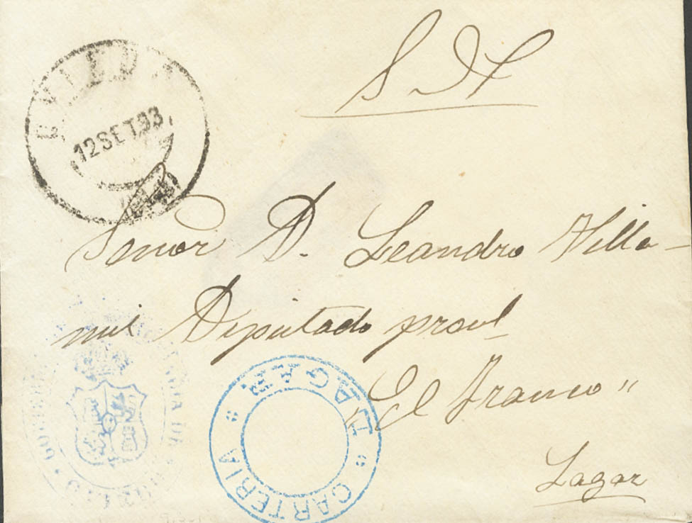 1893. OVIEDO a LAGAR (ASTURIAS). Marca CARTERIA / LAGAR, en azul. MAGNIFICA Y MUY RARA.