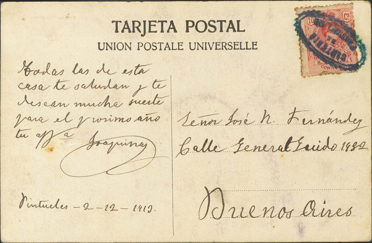 269. 1913. 10 cts rojo. Tarjeta Postal de PINTUELES (ASTURIAS) a BUENOS AIRES (ARGENTINA). Matasello especial CARTERIA / DE / PINTUELES (algo borrosa como se conocen), en azul. MAGNIFICA Y RARISIMA.