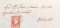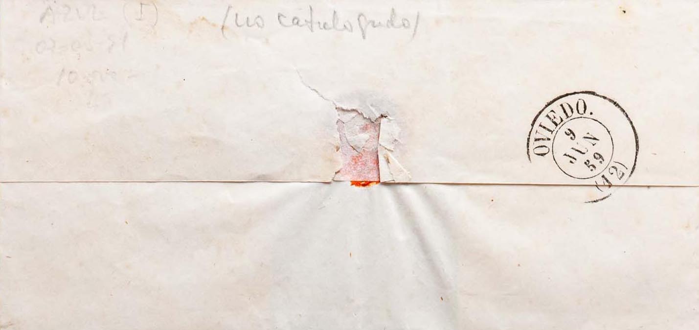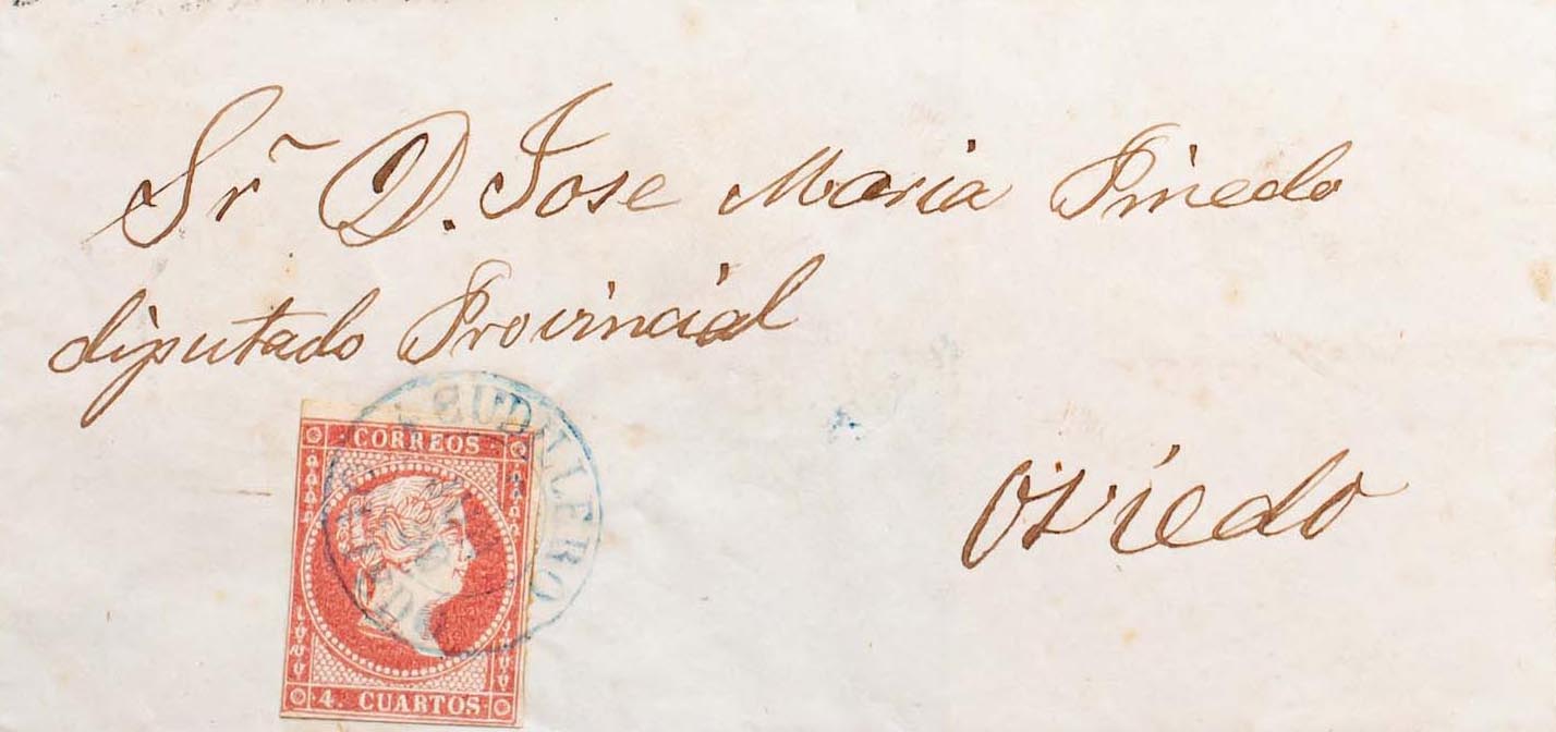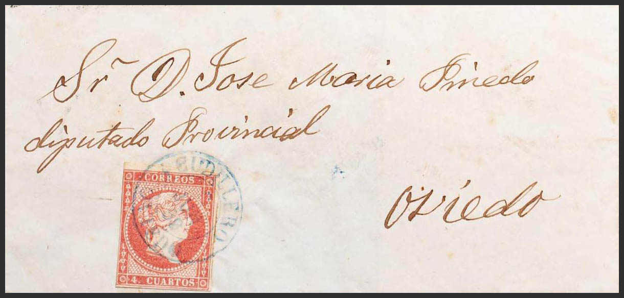 48. 1858. 4 cuartos rojo. CUDILLERO a OVIEDO. Matasello CUDILLERO / OVIEDO (Tipo I), en azul. MAGNIFICA Y RARISIMA.