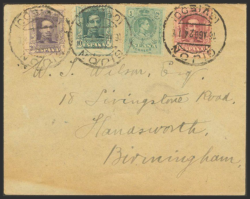 268, 311, 314, 316. 1924. 5 cts. verde, 5 cts. lila, 10 cts. verde y 20 cts. lila. GIJON a BIRMINGHAM (INGLATERRA). Matasello GIJON / (OVIEDO). MAGNIFICO FRANQUEO MIXTO DE DOS EMISIONES.
