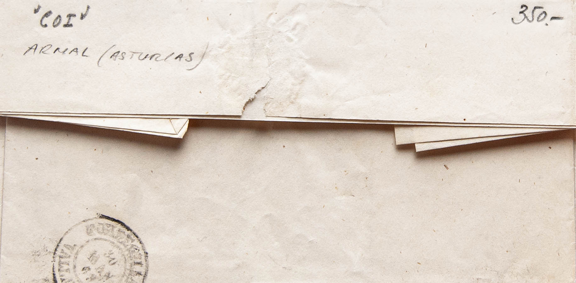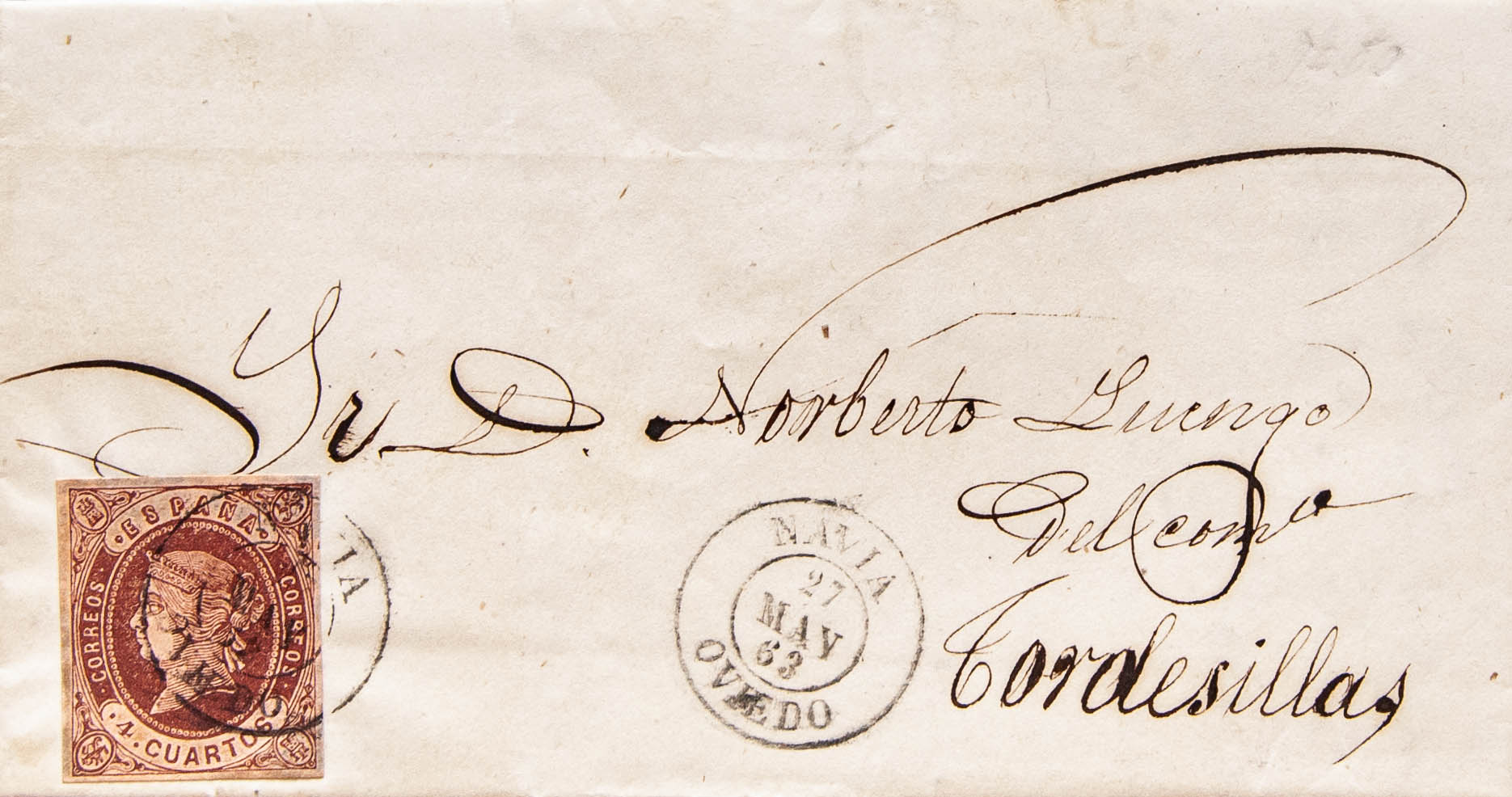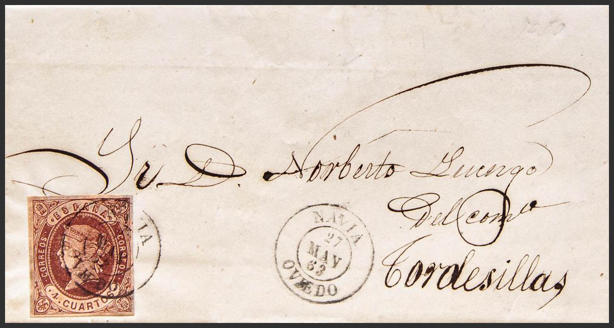 58. 1863. 4 cuartos castaño. ARMAL (ASTURIAS) a TORDESILLAS. Matasello NAVIA / OVIEDO. MAGNIFICA.