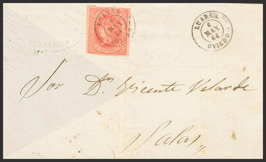 64. 1864. 4 cuartos rosa. LUARCA a SALAS. Matasello LUARCA / OVIEDO. MAGNIFICA.