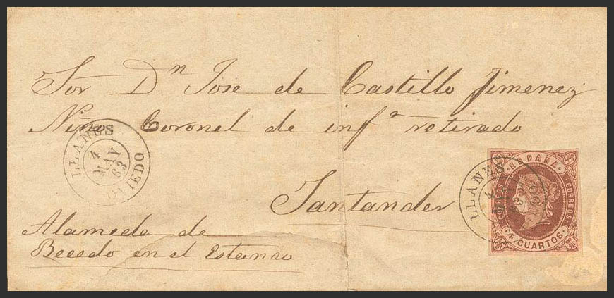 58. 1863. 4 cuartos castaño. LLANES a SANTANDER. Matasello LLANES / OVIEDO. MAGNIFICO.