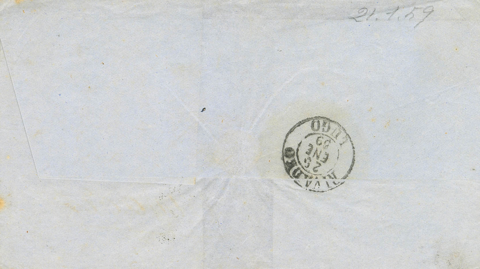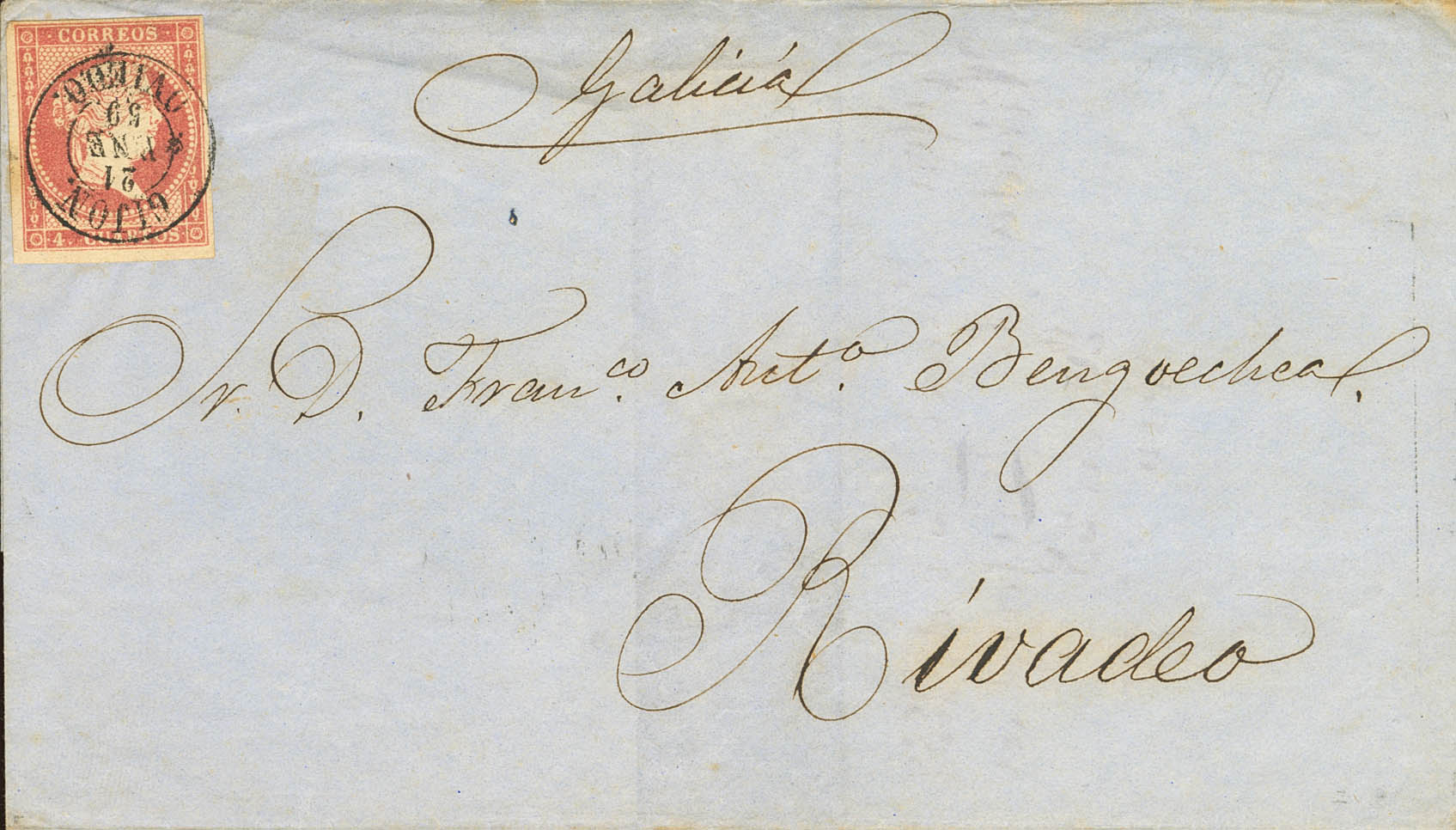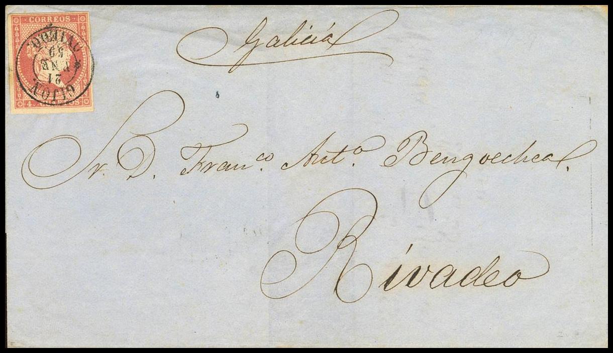 48. 1859. 4 cuartos rojo. GIJON a RIVADEO. Matasello GIJON / OVIEDO. MAGNIFICA.