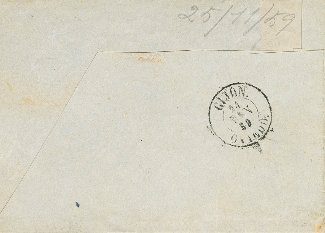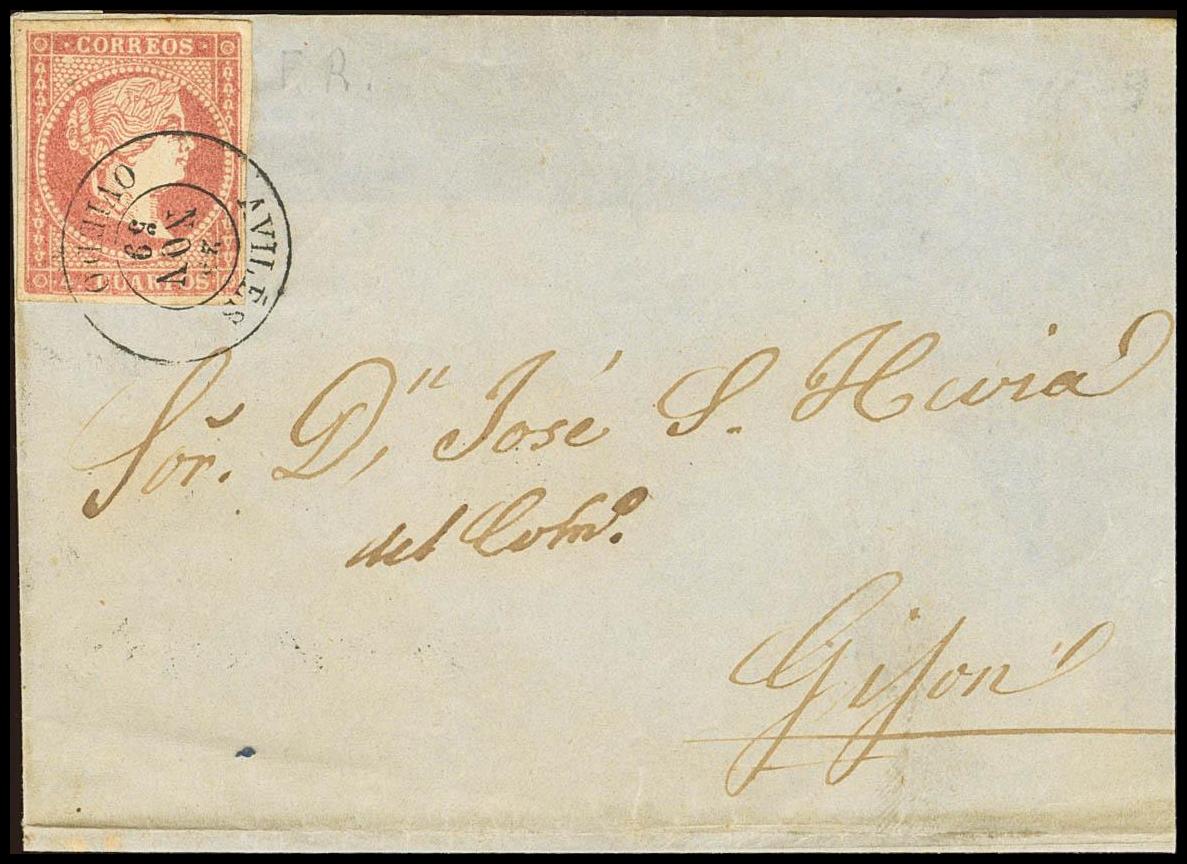 48. 1859. 4 cuartos rojo. AVILES a GIJON. Matasello AVILES / OVIEDO. MAGNIFICA.