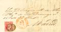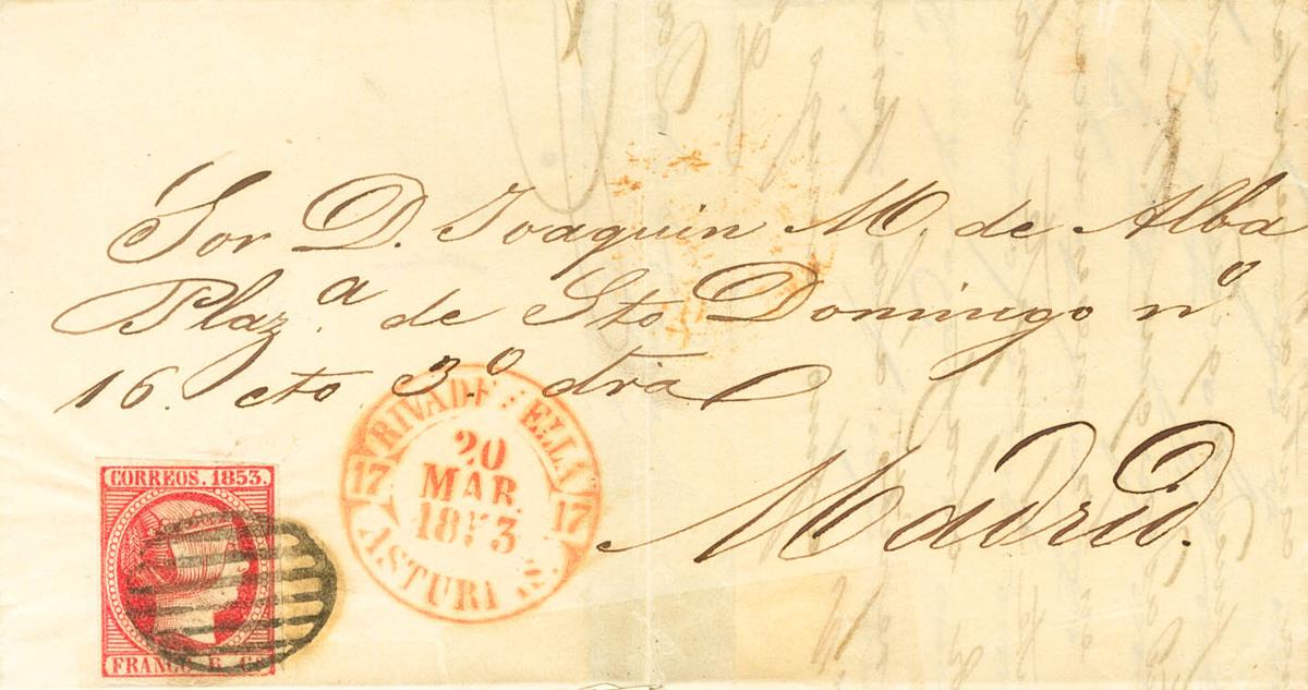 17. 1853. 6 cuartos carmÃn. RIBADESELLA a MADRID. En el frente baeza RIVADESELLA / ASTURIAS, en rojo. MAGNIFICA.