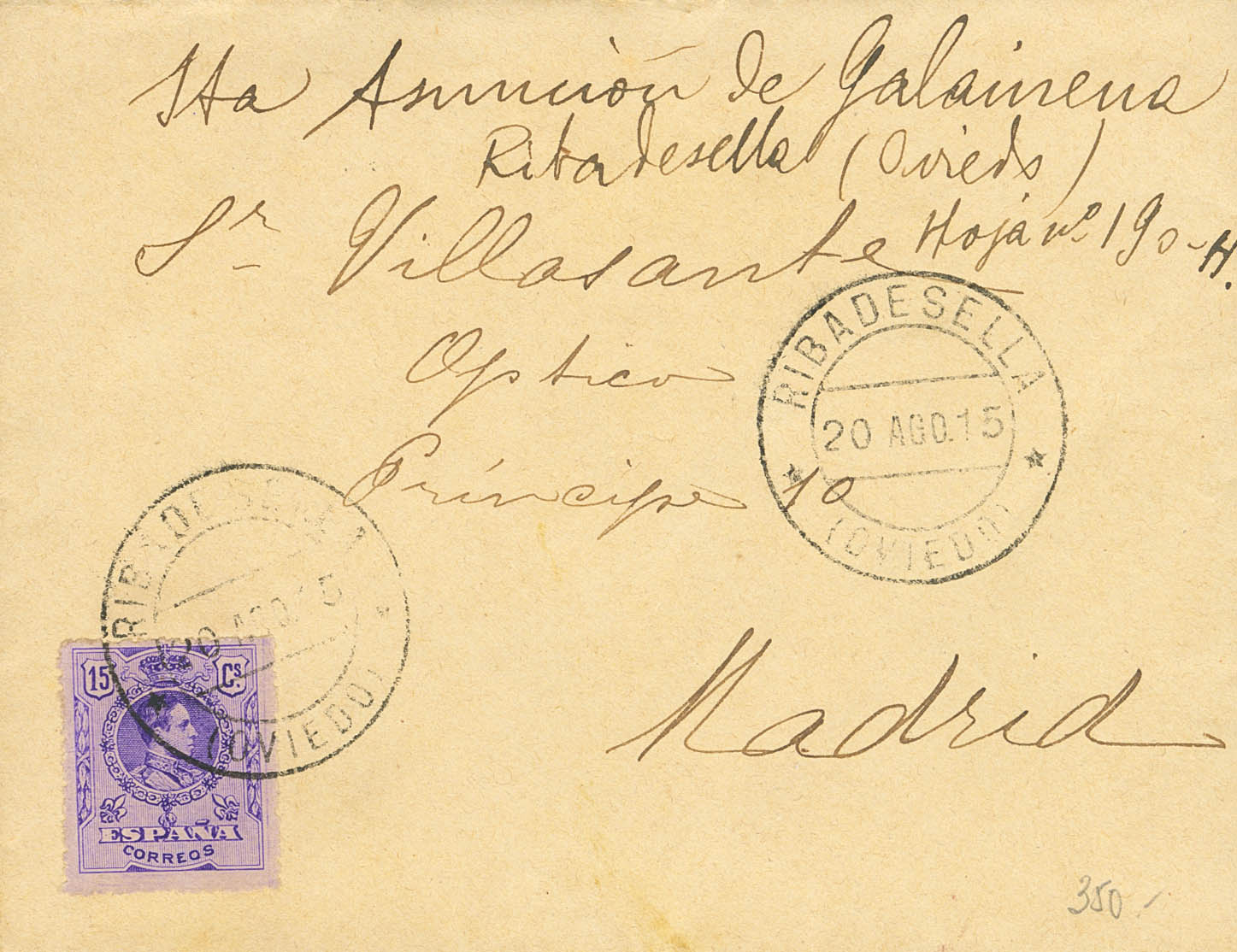 270. 1915. 15 cts violeta. RIBADESELLA a MADRID. Matasello RIBADESELLA / OVIEDO, al dorso llegada. MAGNIFICA.
