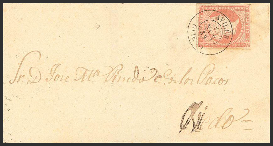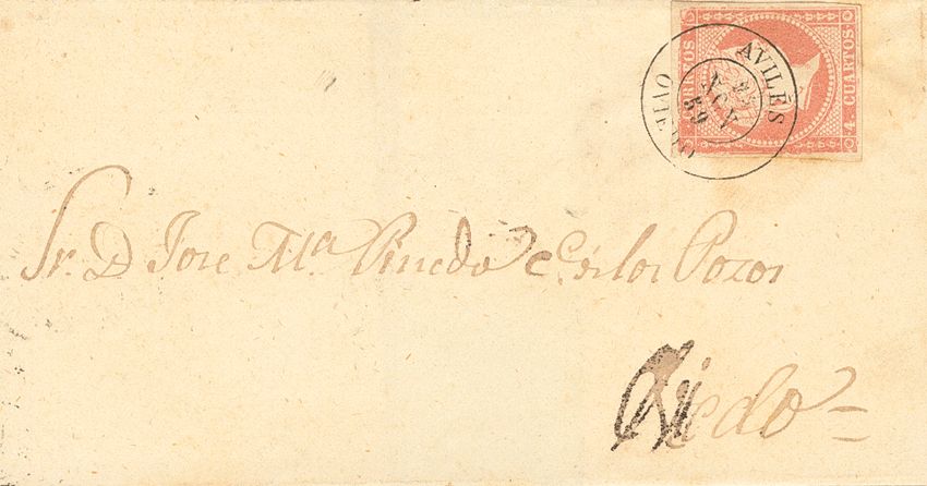 48. 1859. 4 cuartos rojo. AVILES a OVIEDO. Matasello AVILES / OVIEDO. MAGNIFICA.