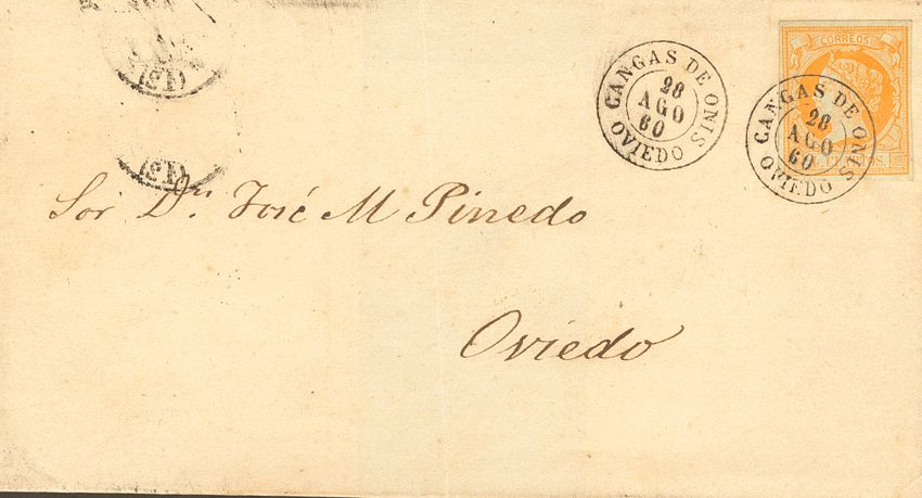 52. 1860. 4 cuartos amarillo. CANGAS DE ONIS a OVIEDO. Matasello CANGAS DE ONIS / OVIEDO. MAGNIFICA.