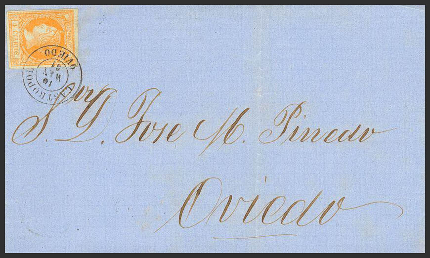52. 1861. 4 cuartos amarillo. CASTROPOL a OVIEDO. Matasello CASTROPOL / OVIEDO. MAGNIFICA.