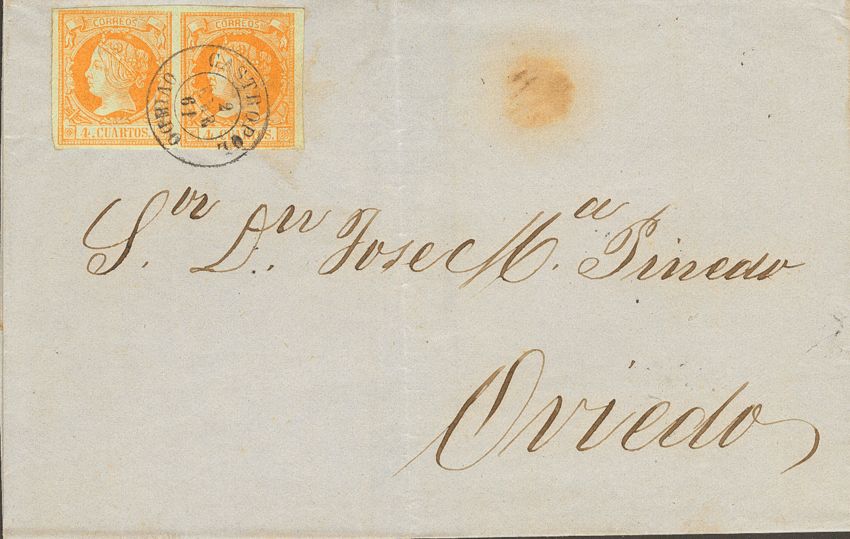 52(2). 1861. 4 cuartos amarillo, pareja. CASTROPOL a OVIEDO. Matasello CASTROPOL / OVIEDO, doble porte. MAGNIFICA.