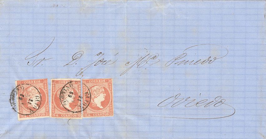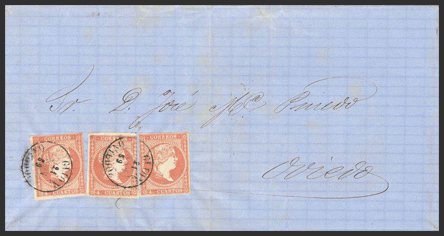 48(3). 1859. 4 cuartos rojo, tres sellos. GIJON a OVIEDO. Matasello GIJON / OVIEDO, triple porte. MAGNIFICA.