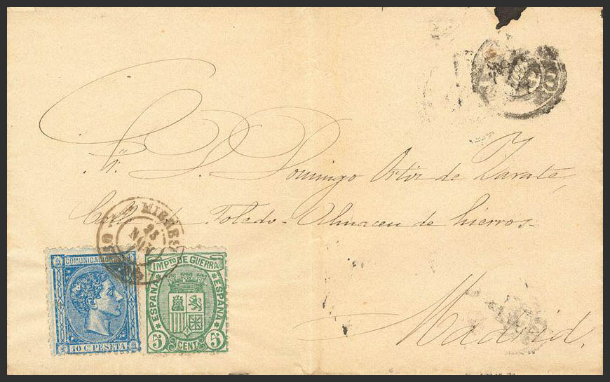 164, 154. 1875. 10 cts y 5 cts. MIERES a MADRID. Matasello MIERES / OVIEDO. MAGNIFICA.