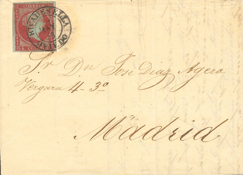 40. 1855. 4 cuartos rojo. RIVADESELLA a MADRID. Matasello RIVADESELLA / OVIEDO (Tipo I). MAGNIFICA.