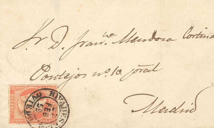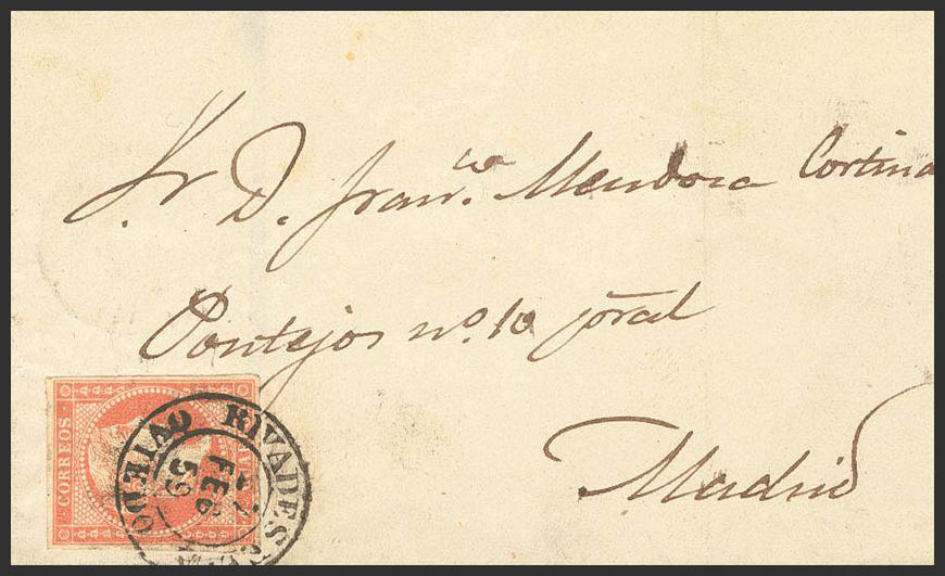 48. 1859. 4 cuartos rojo. RIVADESELLA a MADRID. Matasello RIVADESELLA / OVIEDO (Tipo I). MAGNIFICA.