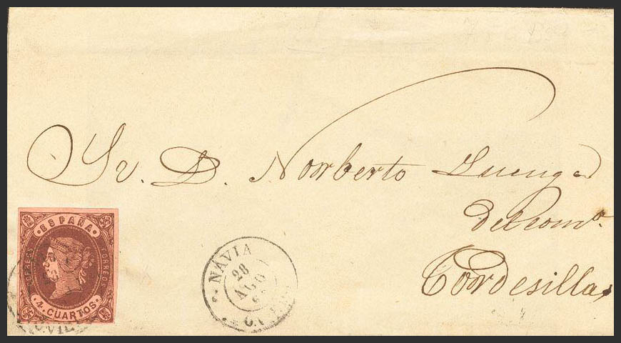 58. 1863. 4 cuartos castaño. NAVIA a TORDESILLAS. Matasello NAVIA / TORDESILLAS. MAGNIFICA.