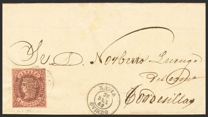 58. 1863. 4 cuartos castaño. NAVIA a TORDESILLAS. Matasello NAVIA / TORDESILLAS. MAGNIFICA.