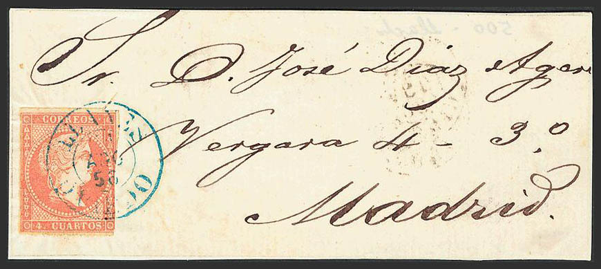 48. 1859. 4 cuartos rojo. Frontal de LLANES a MADRID. Matasello LLANES / OVIEDO (Tipo I), en azul. MAGNIFICO.